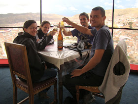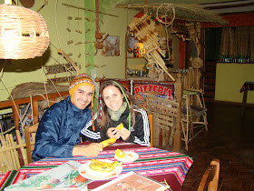 Ao chegar na Plaza de Armas, tiramos algumas fotos e logo retornamos pois, como já era tarde, a cidade estava vazia e não nos sentindo muito bem, resolvemos entrar em uma pizzaria que tinha na porta, a placa anunciando 'sucos naturais', então entramos para comer algumas frutas. Pedimos laranja e banana e ao perguntar quanto custou, o garçom disse que não sabia quanto cobrar, então pagamos 10 Bs., e retornamos ao hostal, afinal, não é normal um cliente entrar em uma pizzaria e pedir banana e laranja! hehehe