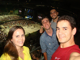 Chegamos no estádio! Os marinheiros de primeira viagem levaram mochila, camiseta reserva, perfume. Não sei não..., mas acho que eles estavam mal intencionados. Na entrada do estádio eles foram barrados e tiveram que deixar o perfume do lado de fora para poder entrar no estádio. Putz que azar!!! E agora? Damos o perfume para o segurança de presente? Jogamos fora? Ou escondemos para pegar na saída? Resolveram esconder o perfume pra poder pegar na saída. Faz de conta que ninguém está vendo onde estamos escondendo o perfume. hahahahahaha. Problema resolvido. Vamos para o show!